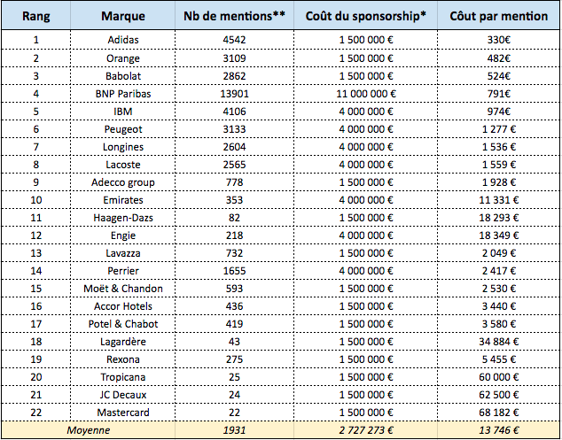 A la première place des mentions associées au Grand Chelem, on retrouve BNP Paribas (13 901), certainement bien aidé par la publicité mettant en scène Wawrinka aux côté de Noah ou encore la plateforme digitale We Are Tennis très active sur les réseaux sociaux.
