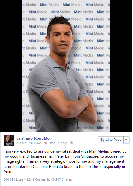 L’objectif de cet accord est bien évidemment de développer les revenus issue de la marque Cristiano Ronaldo en Asie, marché qui est difficile à appréhender sans partenaire local comme l’a indiqué le joueur lui-même : Je suis très excité d’annoncer mon dernier partenariat avec Mint deal détenue par mon ami et homme d’affaire Peter Lim de Singapour qui fait l’acquisition de mes droits d’image. C’est une mouvement très stratégique pour mon équipe qui amènera la marque Cristiano Ronaldo à un autre niveau, surtout en Asie. »