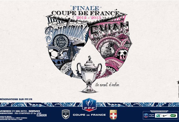 La Fédération Française de Football a associé les contributions des fans des clubs finalistes au talent de l’artiste typographe, Franck Pellegrino, pour élaborer l’affiche de la finale de la Coupe de France 2013 opposant les Girondins de Bordeaux à Evian Thonon Gaillard.
