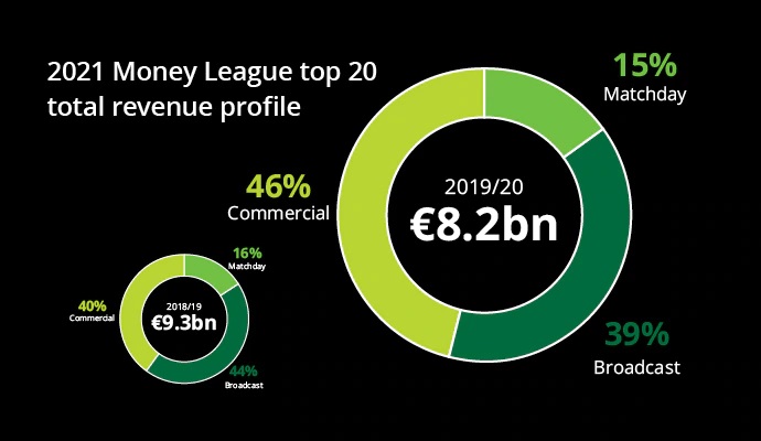 Selon le dernier rapport de Deloitte, les 20 clubs qui ont généré le plus de revenus ont cumulé un total de 8,2 milliards d’euros lors de la saison 2019-2020, un chiffre qui est en recul de 12% par rapport au précédent rapport, soit -1,1 milliard d’euros. Dans le détail, ce sont les revenus commerciaux (sponsoring, merchandising) qui représentent la plus grosse part des revenus du TOP 20 avec 46%. Suivent les droits TV (39%) et les revenus matchday (15%).