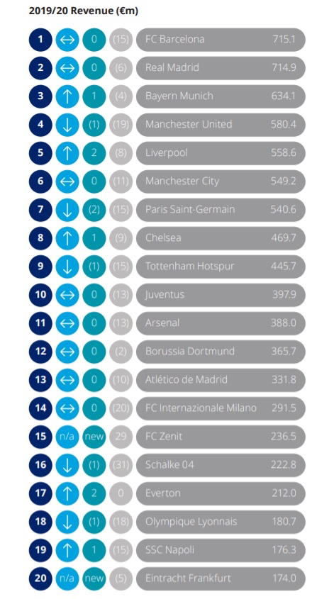 Deloitte Football Money League 2021 – TOP 20 des clubs qui ont généré le plus de revenus en 2019-2020