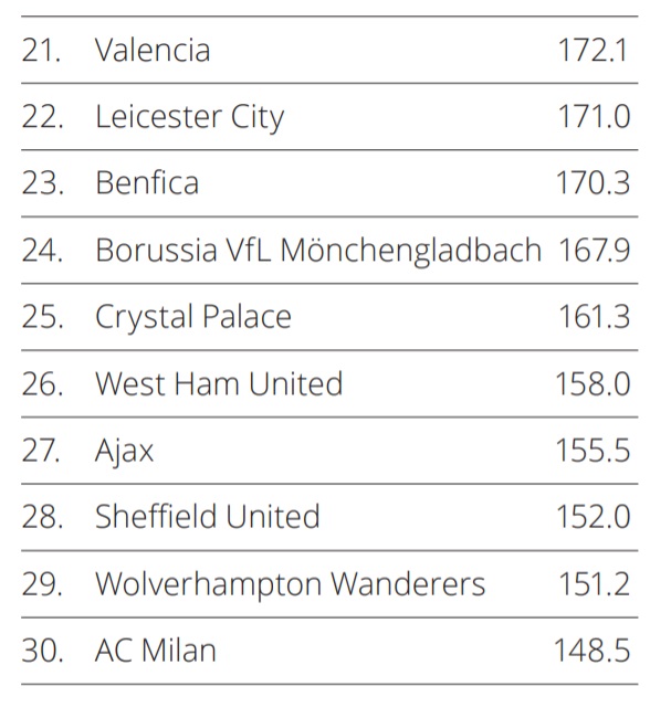 - La France place 2 clubs avec le Paris Saint-Germain (7ème) et l’Olympique Lyonnais (18ème)