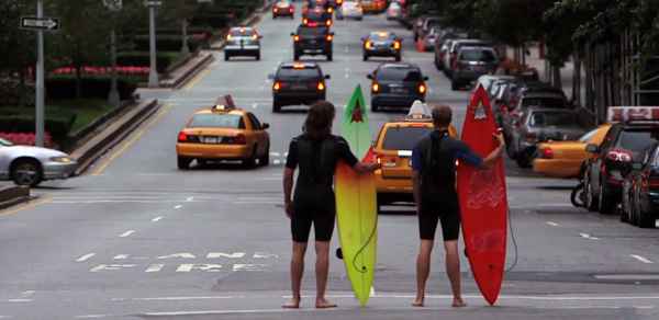 Certes les plus grosses vagues ne se trouve pas à New York City mais cela n’a pas empêché 2 malins de surfer entre voitures et passants de la « Big Apple ».