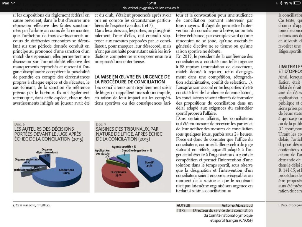 La revue juridique Jurisport et le directeur du service de la conciliation du Comité National Olympique et Sportif Français (CNOSF) Antoine Marcelaud ont publié un dossier dressant un panorama des propositions de conciliation du CNOSF qui ont eu lieu en 2015.