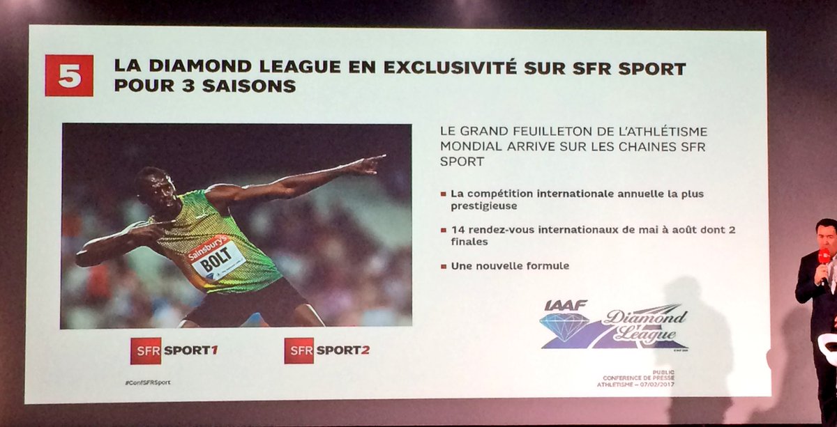 Il y a quelques mois, la Fédération Française d’Athlétisme et le groupe Altice (SFR) signaient un accord de diffusion exclusif. La conférence de cet après-midi est venu présenter la nouvelle grille athlétisme de la chaîne avec, cerise sur le gâteau donc, l’annonce de l’arrivée de la Diamond League, feuilleton de l’athlétisme international qui entre dans une nouvelle ère dès cette année.