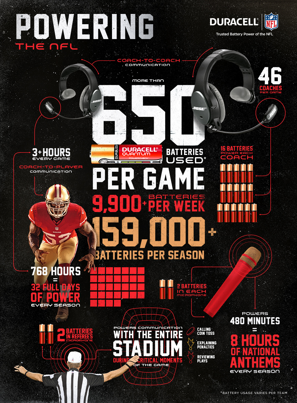 A l’occasion de cette nouvelle campagne, la marque Duracell a également réalisé une infographie plutôt sympa présentant quelques chiffres clés du partenariat avec la NFL. Entre les micros et les casques de la marque Bose, ce sont pas moins de 650 piles qui sont ainsi utilisées lors de chaque rencontre NFL, soit un total de 159 000 sur une saison.