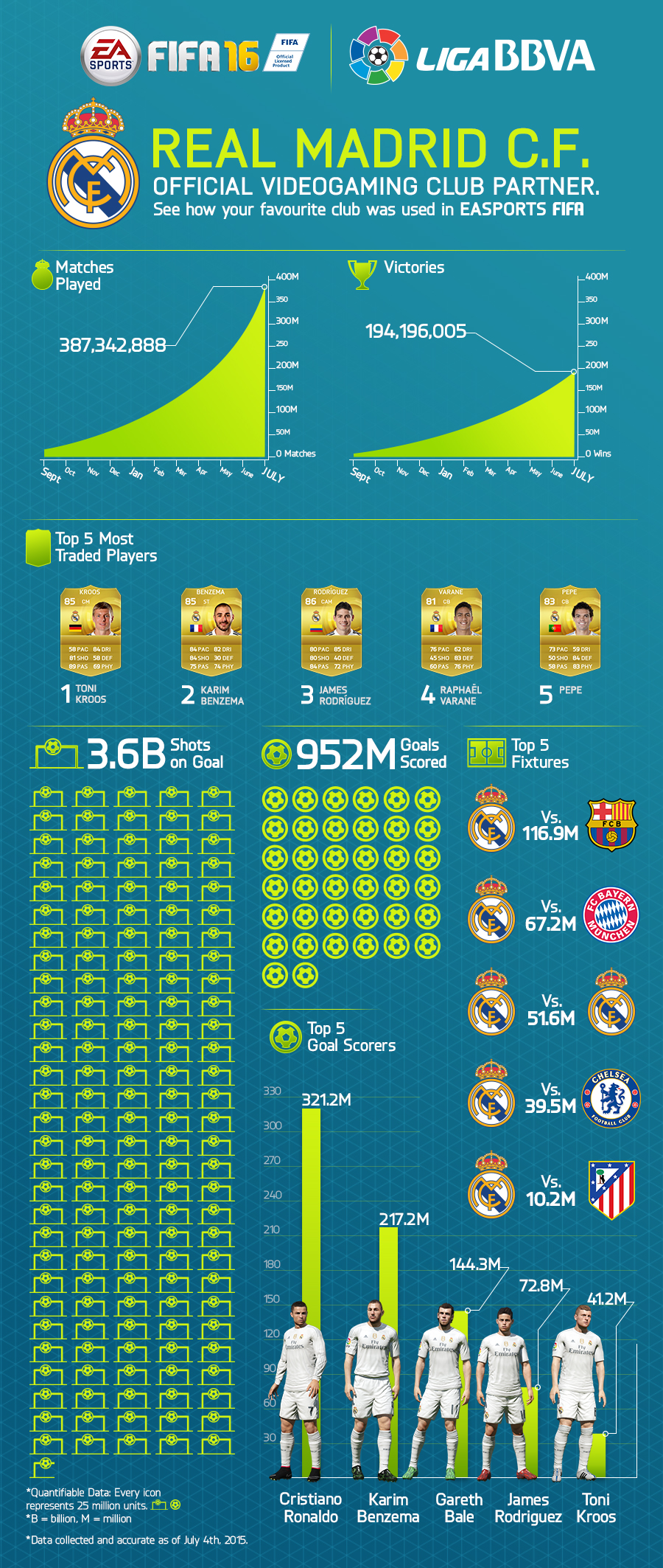 A noter que le partenariat se poursuivra également dans le stade Santiago Bernabéu. Les jours de match, le grand écran du stade retransmettra à diverses occasions des images issues du jeu comme les célébrations des joueurs du Real Madrid après leurs buts. Les supporters des équipes visiteuses pourront également tester le jeu FIFA 16 dans une nouvelle zone expérimentale située au sein du stade Santiago Bernabéu. De plus, les fans peuvent s’attendre à voir du contenu EA SPORTS dans le stade et sur la chaîne de télévision numérique du Real Madrid.