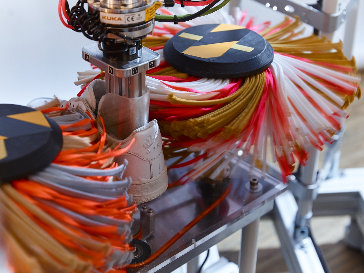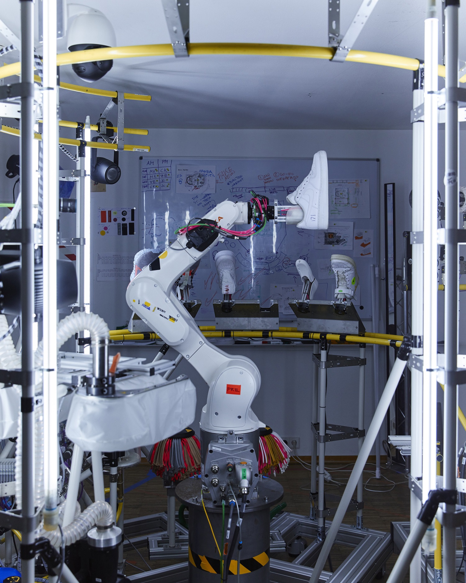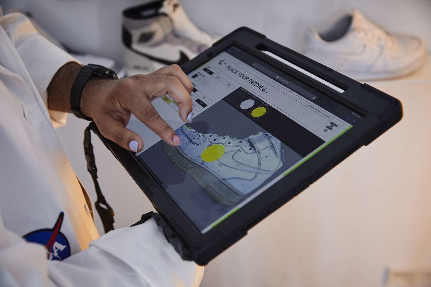 Pensé pour prolonger la durée de vie des sneakers, le robot lave, répare et customise avec des patchs les paires usagées, quelques modèles de la marque pour le moment (Air Force 1, Air Jordan 1, Space Hippie 01, Nike Dunks). L’opération de rénovation dure quelques 45 minutes.