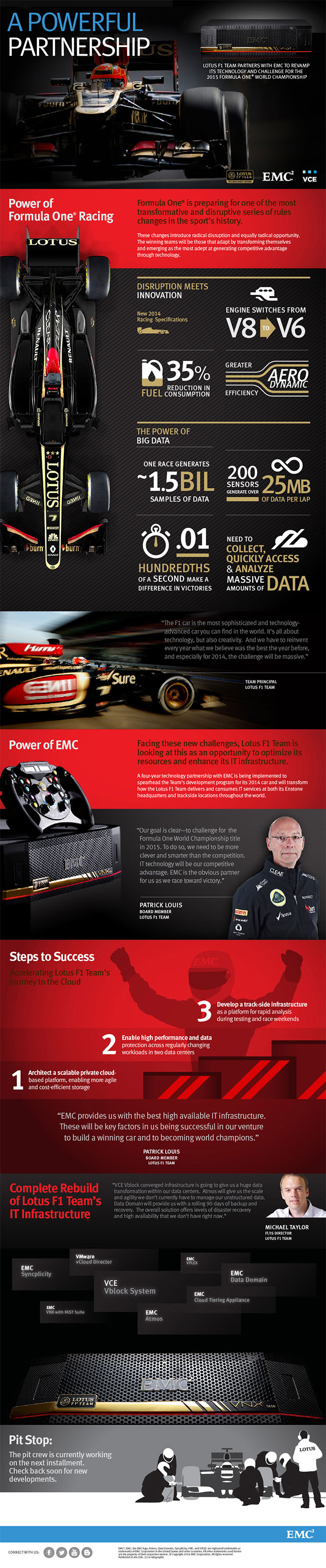 En 2014, Lotus F1 Team souhaite redéfinir entièrement son infrastructure en diminuant l’encombrement et le coût, sans altérer la puissance. Au siège d’Enstone comme sur les circuits, EMC a installé les technologies et les services informatiques requis pour mener Lotus F1 Team vers la victoire.