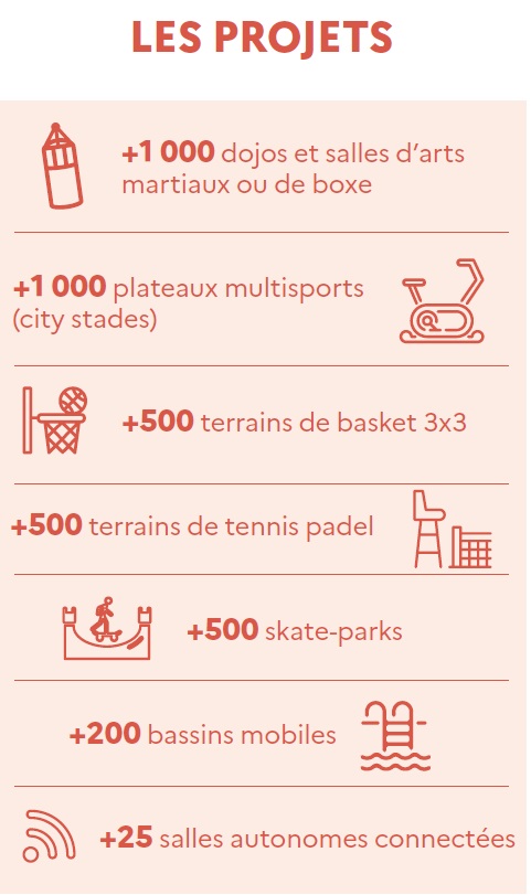 1 000 dojos et salles d’arts martiaux ou de boxe, 1 000 plateaux multisports, 500 terrains de basket et autant de padel ou encore 200 bassins mobiles pour apprendre à nager aux tout petits devraient éclore dès 2022 dans les quartiers, zones rurales ou carencées de l’hexagone et des territoires ultramarins.