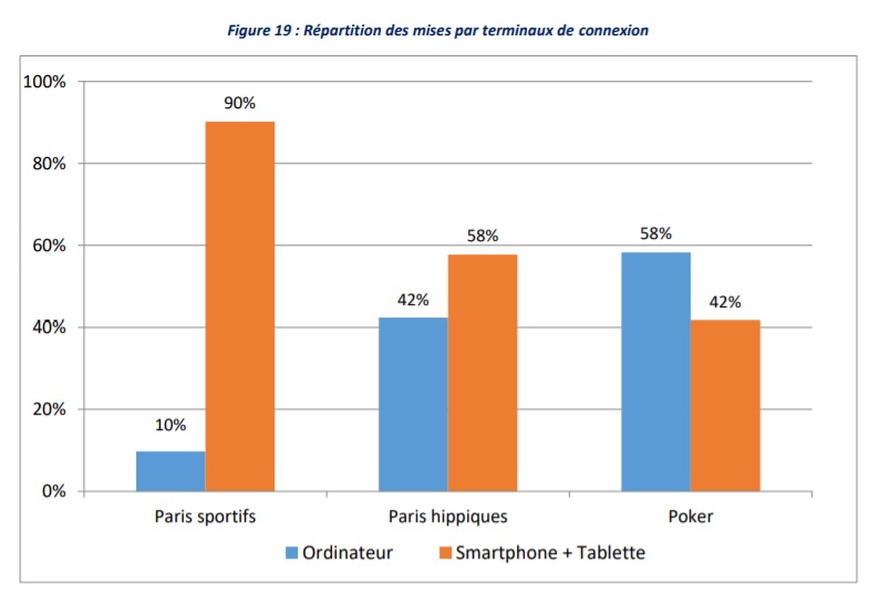 Outre les sommes misées et les compétitions plébiscitées, l’ANJ s’est également intéressé à la répartition des mises par terminaux de connexion, comprenez les devices utilisés par les parieurs. Les enjeux sur terminaux mobiles représentent 90% de l’activité (+7 points par rapport à l’an passé).