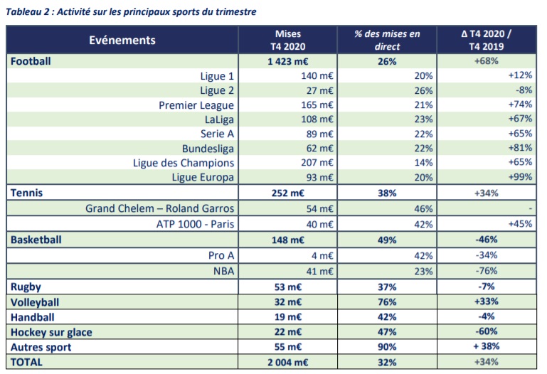 En regardant de près le 4ème trimestre de l’année 2020 (octobre, novembre, décembre), on constate que le football reste le sport qui engage le plus les parieurs français avec un total de 1,423 milliard d’euros misés.