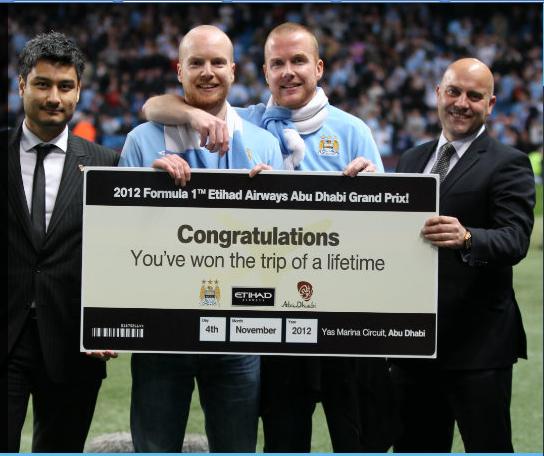 Etihad Airways, sponsor de Manchester City, a, lors du derby mancunien, offert à un supporteur du club le voyage de sa vie pour assister au Grand Prix de Formule 1 Etihad Airways d’Abu Dhabi 2012. En plus de voir son équipe de retour au sommet de la Premier League, Rob Dulson, le fidèle fan de City, a remporté un séjour de trois jours tous frais payés comprenant le vol aller-retour, trois nuits dans un luxurieux hôtel d’Abu Dhabi et bien sûr deux places pour assister au Grand Prix. Si vous aussi souhaitez y assister, rendez-vous sur la page facebook d’Etihad Airways pour tenter de remporter ce pack privilège.