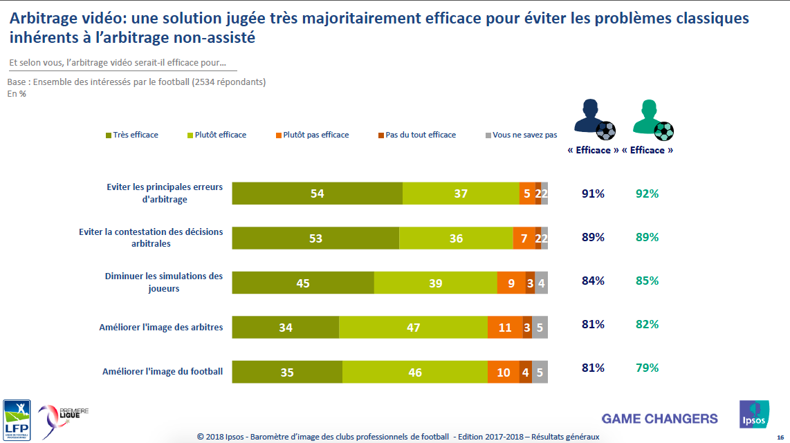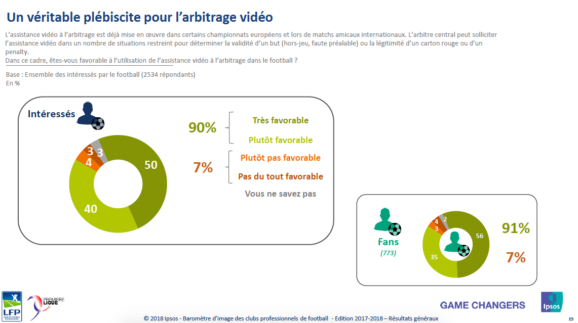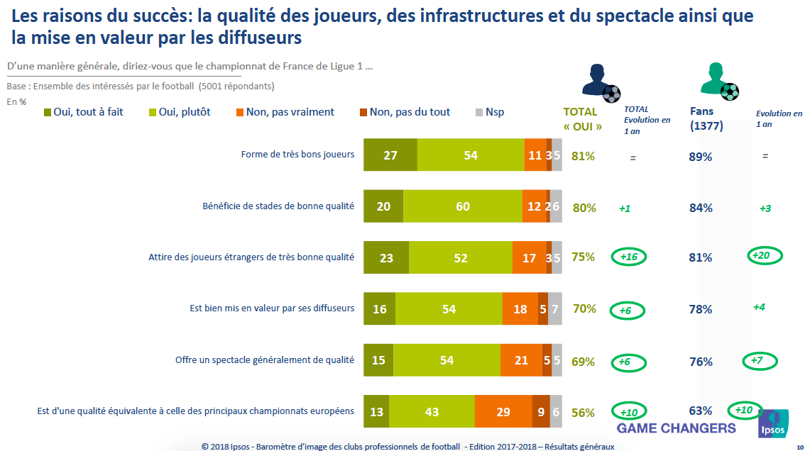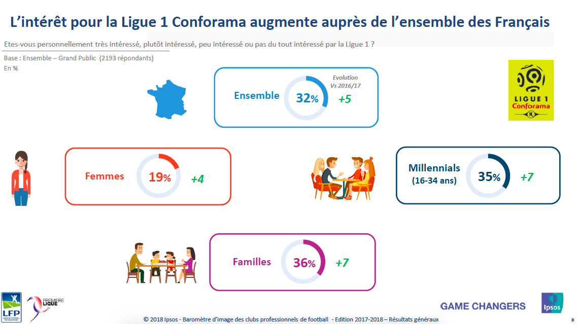 Par la suite, 5001 Français « intéressés par le football » ont été sondés du 7 décembre 2017 au 3 janvier 2018. Là aussi, la popularité grandissante du football est vérifiable puisque 86% des sondés ont une bonne image de la Ligue 1 Conforama, ce qui représente une augmentation de 5 points par rapport à la saison dernière. « Il s’agit du meilleur résultat depuis l’après Coupe du monde en Afrique du Sud », s’est réjouit Jean-François Doridot, directeur général d’Ipsos.