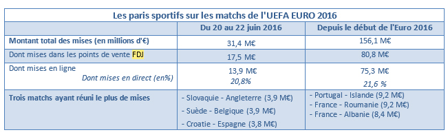 Les bons résultats des paris sportifs en France constatés au début de l’Euro 2016 se poursuivent. Entre le 20 et 22 juin, ce sont plus de 31,4 millions d’euros de mises qui ont été enregistrés en France selon l’ARJEL, faisant ainsi monter à 156,1 millions d’euros les mises enregistrées au total depuis le début de la compétition.