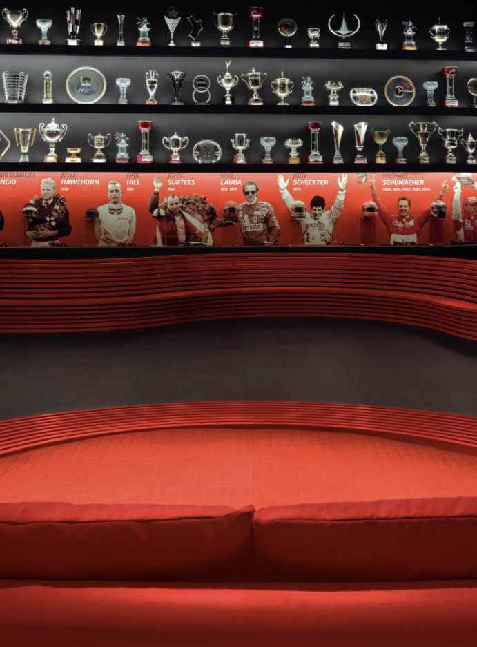 Ce lit, entouré par des modèles de F1, est fait du même cuir que les sièges des Ferrari. Une fois à l’intérieur, les privilégiés auront vu sur les 110 trophées et les voitures qui les ont remportés.
