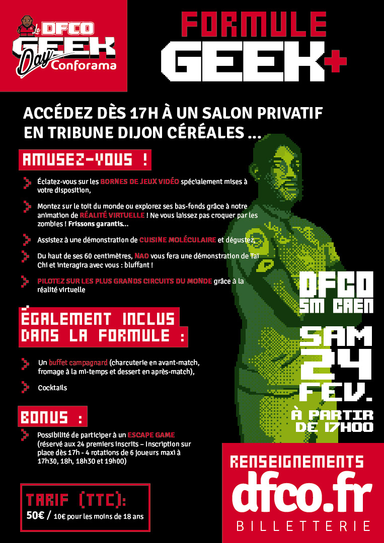 Le 24 février prochain, le Dijon Football Côte-d’Or accueillera le Stade Malherbe de Caen dans son stade Gaston-Gérard. À l’occasion de cette 27ème journée de Ligue 1 Conforama, le club dijonnais va proposer une expérience mettant la culture des jeux vidéo à l’honneur avec son « DFCO Geek-Day Conforama ».