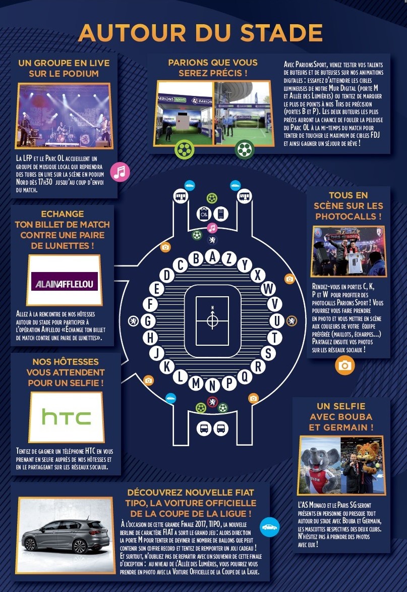 Outre la cérémonie d’arrivée du Trophée, la LFP prévoit également de nombreuses animations au travers de la présence de ses partenaires et sponsors. L’ouverture des portes est prévue pour 17h30. L’occasion pour les supporters de découvrir ce que proposeront Parions Sport (FDJ), Alain Afflelou, Fiat Tipo, Triangle Intérim, HTC, La Poste, Uhlsport ou encore Auto Sécurité. Mathieu Ficot prévient, sur un ton léger, « qu’Alain Afflelou n’a pas ammené Sharon Stone à Lyon pour la finale ». Pour rappel, l’actrice américaine est l’égérie de l’opticien.