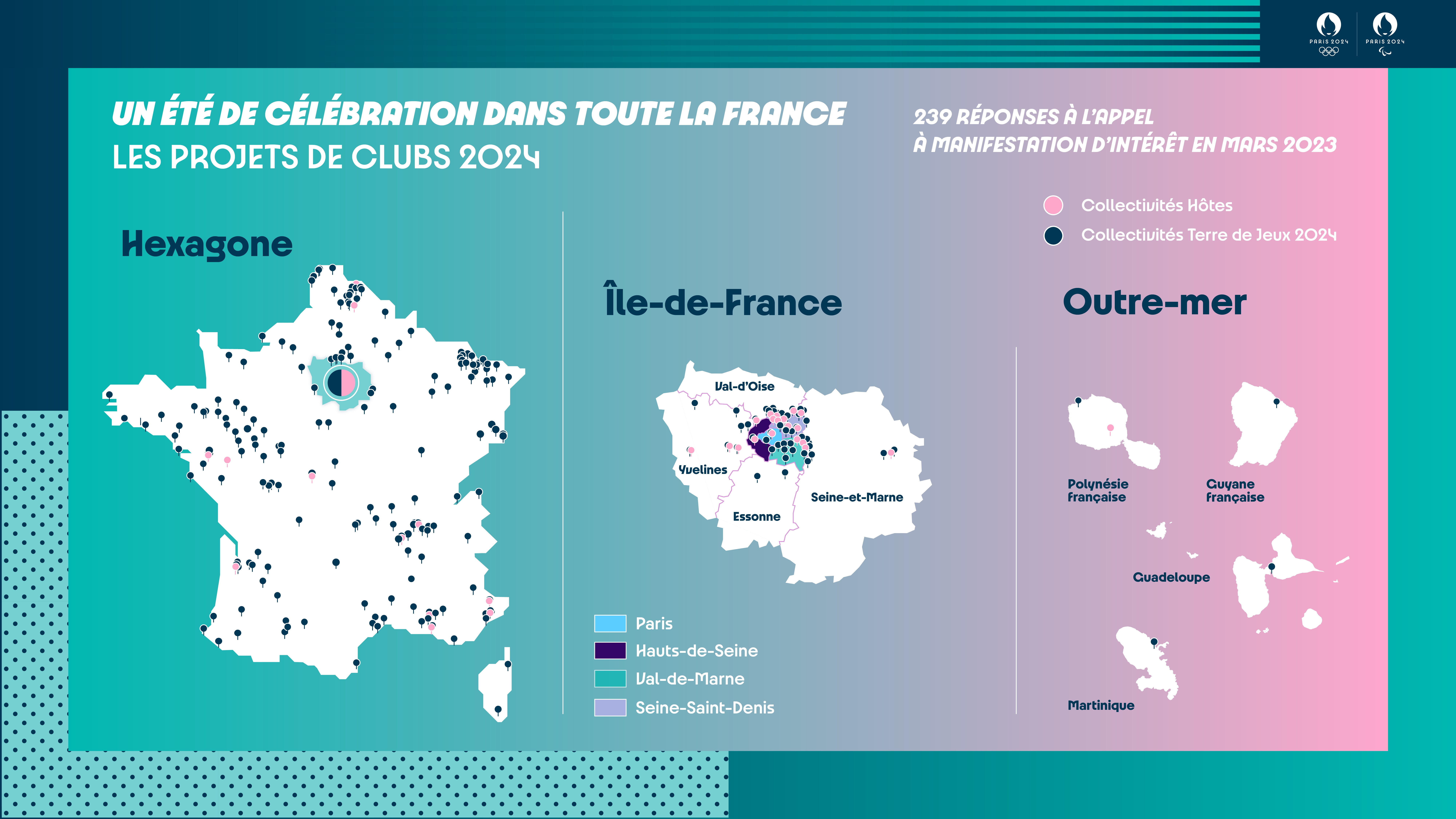 D’autres lieux de festivités dans Paris (Off des Jeux à Paris) et en province ont également été dévoilés comme le Parvis de l’Hôtel de Ville, le Parc Georges-Valbon à La Courneuve, les îles de loisirs d’Île-de-France ou encore les Clubs 2024.