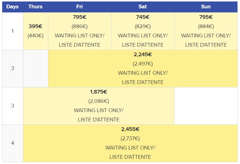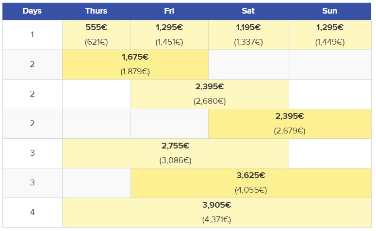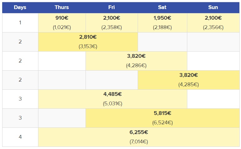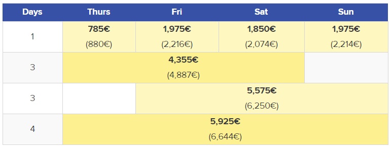 Dans son programme d’hospitalités, l’organisation propose plusieurs prestations avec des prix variant de 395€ à 2100€ HT par personne et par jour. Pour le prix le plus bas, l’offre concerne le « Samuel Ryder Club » et la journée du jeudi (cérémonie).