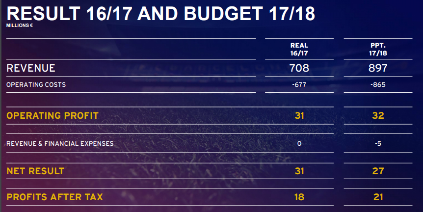 Du côté des profits, le FC Barcelone table sur 21M€ pour la saison 2017-2018 contre 18,1M€ en 16/17.