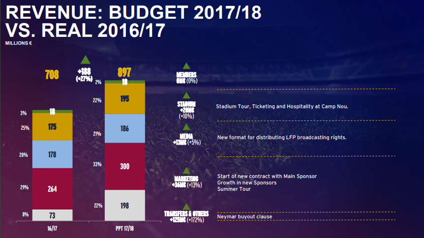 Précisons que le chiffre de 897M€ avancé par le club catalan inclut les ventes de joueurs et donc le paiement de la clause de Neymar JR. Dans le document du club ci-dessous, le montant de 198M€ pour « les transferts et autres » est avancé. Cette saison encore, la majorité des revenus du Barça proviendra du marketing et sponsoring à hauteur de 300M€. Pour la saison 2016-2017, le Barça a réalisé 708M€ de revenus.