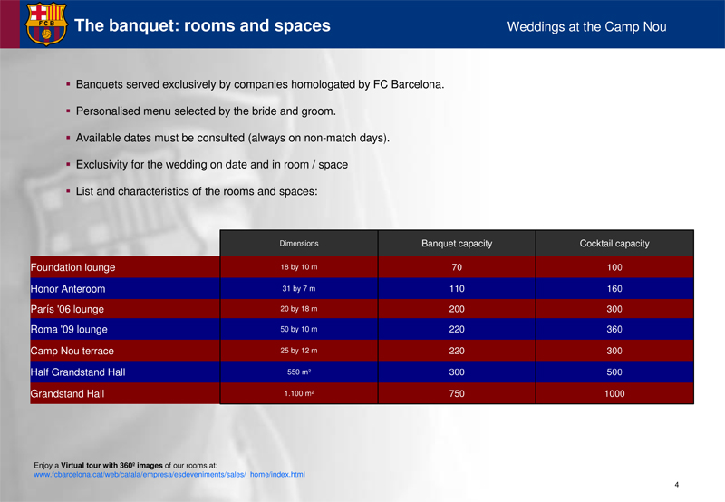 Pour une cérémonie civile sur la terrasse extérieure du Camp Nou, comptez 2400€ pour 200 invités maximum. Comptez 6500€ supplémentaires pour louer la terrasse pour 6 heures afin d’organiser votre banquet. Côté menu, les tarifs débutent à 95€ par personne.