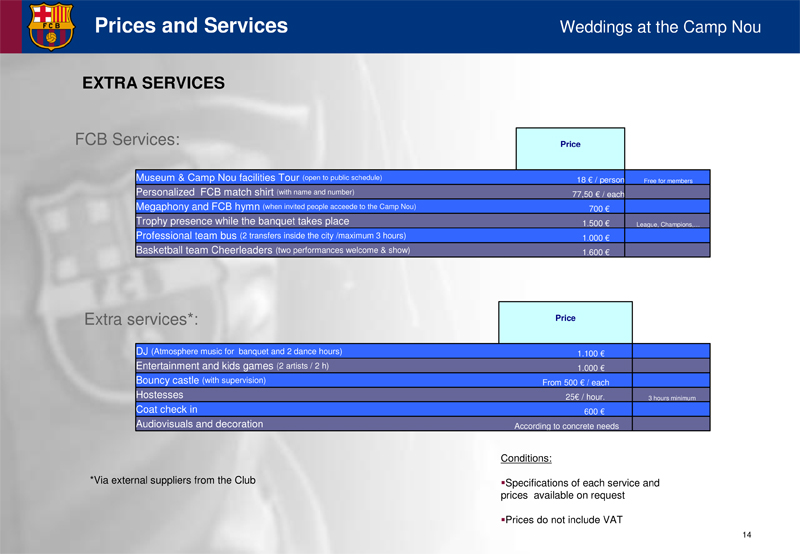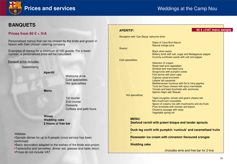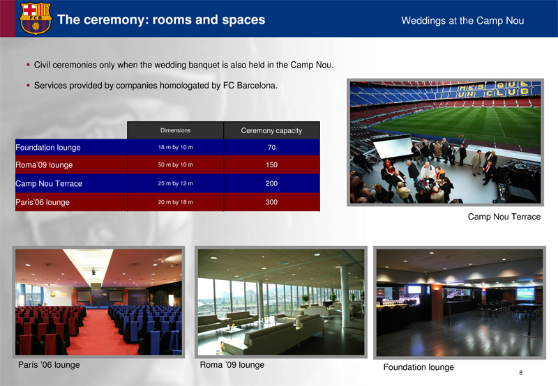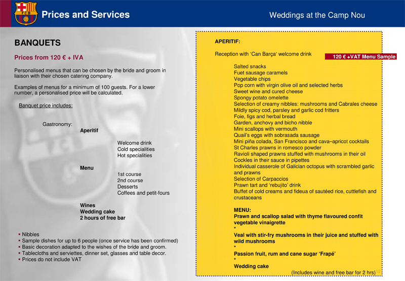 Et vous ? Seriez-vous prêt à vous marier au Camp Nou ? Si la réponse et oui, nous vous laissons jeter un oeil ci-dessous aux prix des prestations proposées.