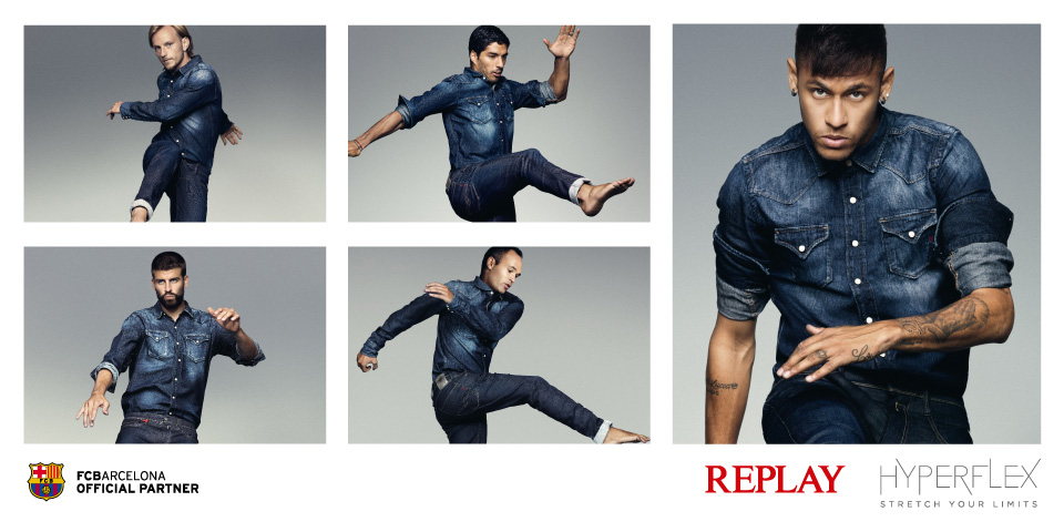 Dans le cadre du partenariat signé il y a un an entre le FC Barcelone et Replay, la marque italienne de vêtements vient de présenter sa nouvelle publicité mettant en scène Luis Suarez, Neymar, Andrés Iniesta, Gerard Piqué et Ivan Rakitic. Pour vanter les mérites des jeans Replay « HYPERFLEX », les joueurs du FC Barcelone testent les limites des pantalons en compagnie de mannequins hommes et femmes, le tout sous le contrôle du Top model Alessandra Ambrosio qui joue le rôle de la responsable des études. Un clip entre étirements, football et booty shake ! « Stretch Your Limits ! »