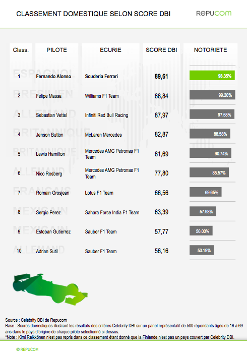 En parallèle, Repucom a également présenté son classement en se basant sur le pays d’origine du pilote. “Le classement pays par pays est également riche d’enseignements. En effet, si Alonso obtient logiquement un score DBI très élevé en Espagne et en Italie, il n’en va pas nécessairement de même pour d’autres pilotes dans leur pays respectif. Au Brésil par exemple, Felipe Massa est connu par 99,2% de la population. Mais le taux de notoriété n’est pas le seul élément à prendre en compte. Le score DBI s’appuie sur plusieurs critères complémentaires pour décrypter la perception du public pour les célébrités : sympathie, confiance, aspiration, intérêt, tendance, influence et sponsoring. Ces éléments qui pèsent pour 40% du score DBI total sont déterminants notamment pour comprendre l’impact d’une personnalité sur un produit ou une marque dans le cadre d’une association d’image. En reprenant le cas de Felipe Massa, nous constatons que malgré un taux de notoriété record, son score DBI total ne le place pour les brésiliens qu’à la 40ième place des personnalités les plus « bankables » dans le monde ».