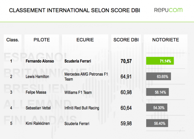 Alors que le grand cirque de la Formule 1 fera sa rentrée ce week-end en Australie, Repucom dévoile les résultats de son étude concernant le potentiel marketing et bankable des pilotes. Via son outil CelebrityDBI qui prend en compte différents critères (notoriété, sympathie, confiance, aspiration, intérêt, tendance, influence et sponsoring), l’étude de Repucom, réalisée dans 13 pays (Royaume-Uni, Allemagne, France, Italie, Espagne, Turquie, Russie, Argentine, Brésil, Mexique, Etats-Unis, Chine, Inde) présente Fernando Alonso comme le pilote le plus « bankable » en Formule 1 avec un score DBI de 70,57. Lewis Hamilton occupe la deuxième place de ce classement suivi par… Felipe Massa. Le quadruple champion du monde Sebastian Vettel arrive en 4ème position.