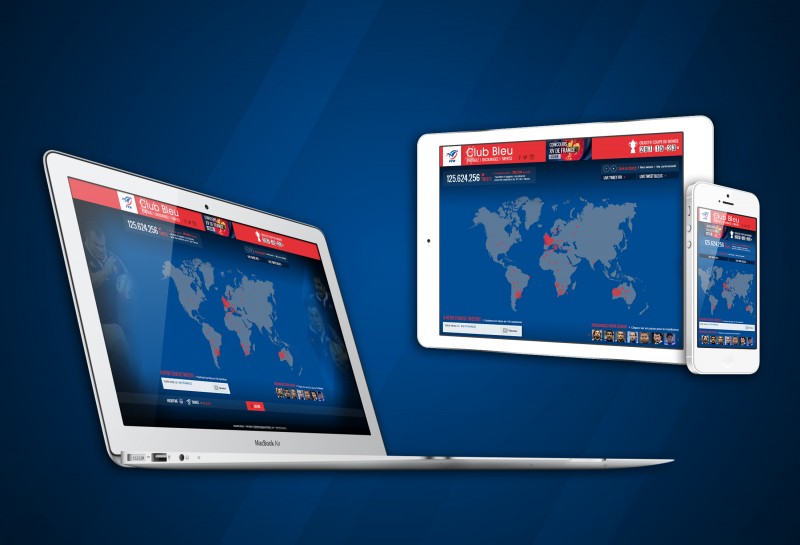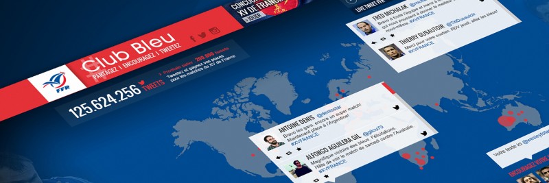 A moins d’un an de la Coupe du Monde de Rugby 2015 qui se disputera en Angleterre, La Fédération Française de Rugby (FFR) et l’agence Buzznative lancent la plateforme digitale club-bleu.com qui donne accès à l’ensemble de l’écosystème digital de la FFR. Les Fans des Bleus pourront notamment découvrir la « Tweet Map », une mappemonde sociale dynamique qui met en avant l’engagement de la communauté du XV de France. Cet espace agrégera donc du contenu (texte et images) postés par les fans depuis Twitter et Instagram principalement via les hashtags #soutienslexv #XVFrance et #ClubBleu. Le Fan pourra naviguer dans une carte interactive, encourager son joueur préféré en le mentionnant, suivre les actualités des bleus, vivre les matches en Live Tweet ou encore tenter de remporter de nombreux lots mise en jeu. Bref, vivre une véritable expérience digitale 100% XV de France ! .