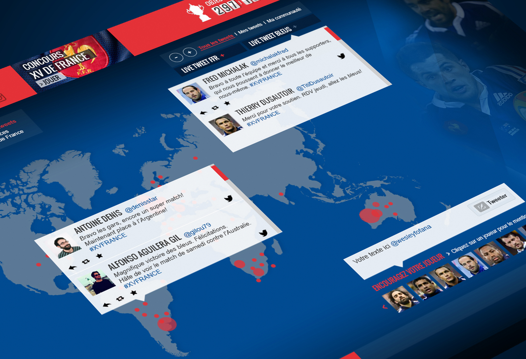 A noter qu’un compteur affichera également le nombre de tweets générés autour des conversations liées au XV de France. Cette plateforme sociale est la première phase d’un dispositif social qui accompagnera les Bleus jusqu’à la Coupe du Monde 2015 !