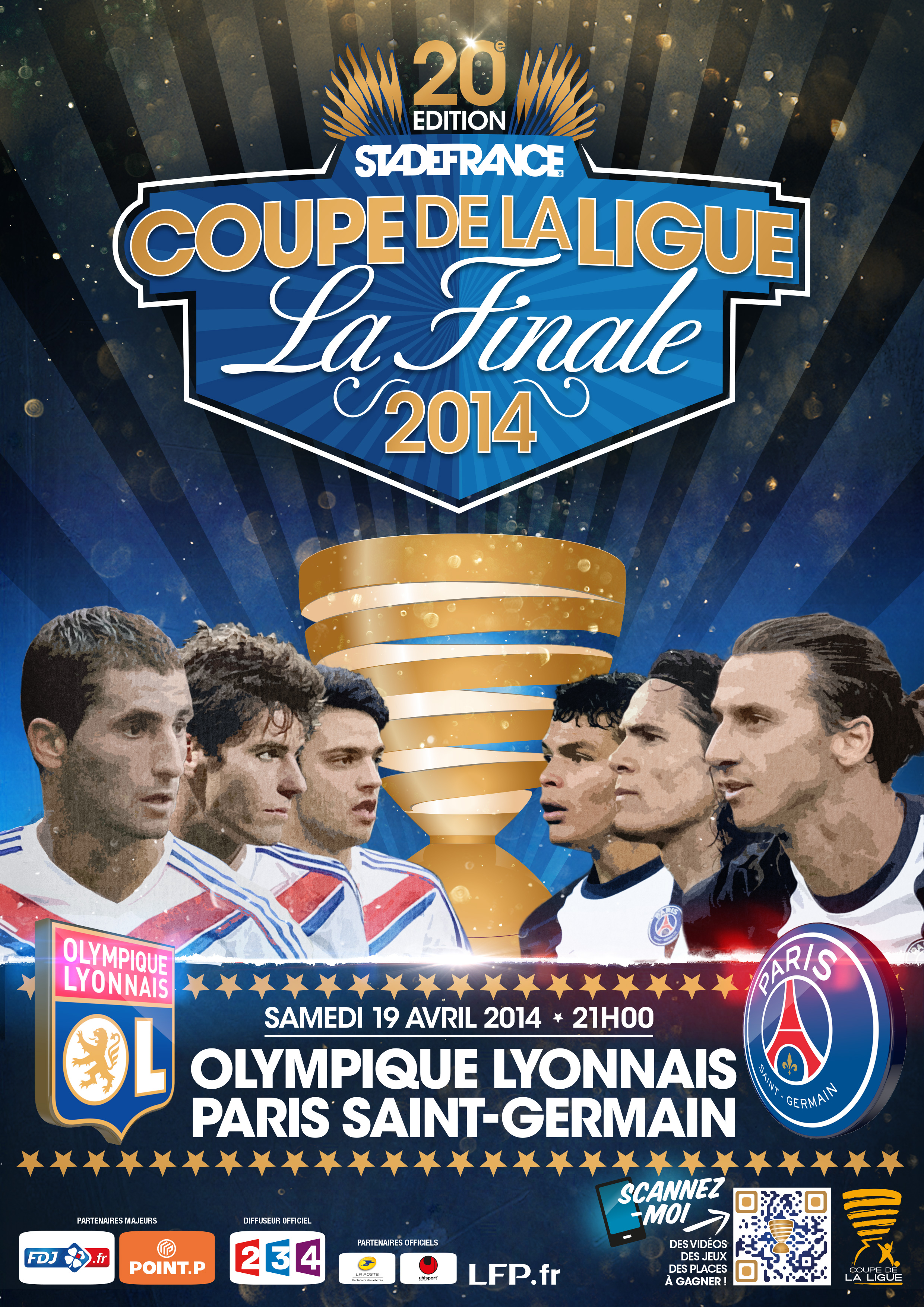 Pour célébrer cette 20ème Finale de Coupe de la Ligue, la LFP a dévoilé hier le visuel de l’affiche (voir ci-dessus) réalisée par l’agence MGH!. Pour la première fois, l’affiche présente un QR code qui permettra au public d’accéder à du contenu vidéo, des informations ou encore différents concours. Cette rencontre sportive entre l’OL et le PSG devrait également être l’occasion pour les fans présents au Stade de France de vivre plus qu’un match de football. Les différents partenaires de la Coupe de la Ligue comme Point.P et la FDJ.fr devraient ainsi proposer différentes animations aux abords du Stade de France.