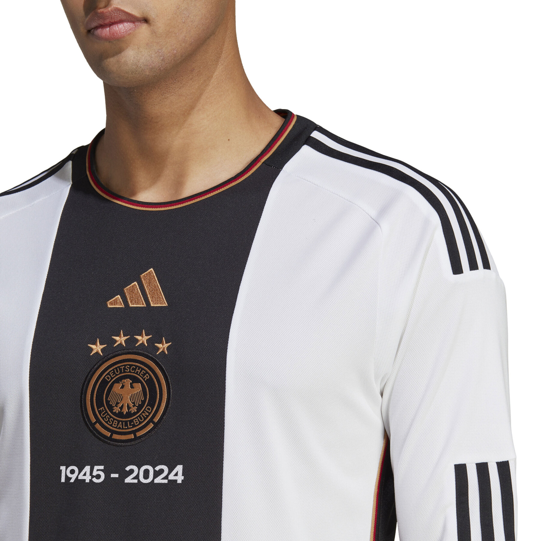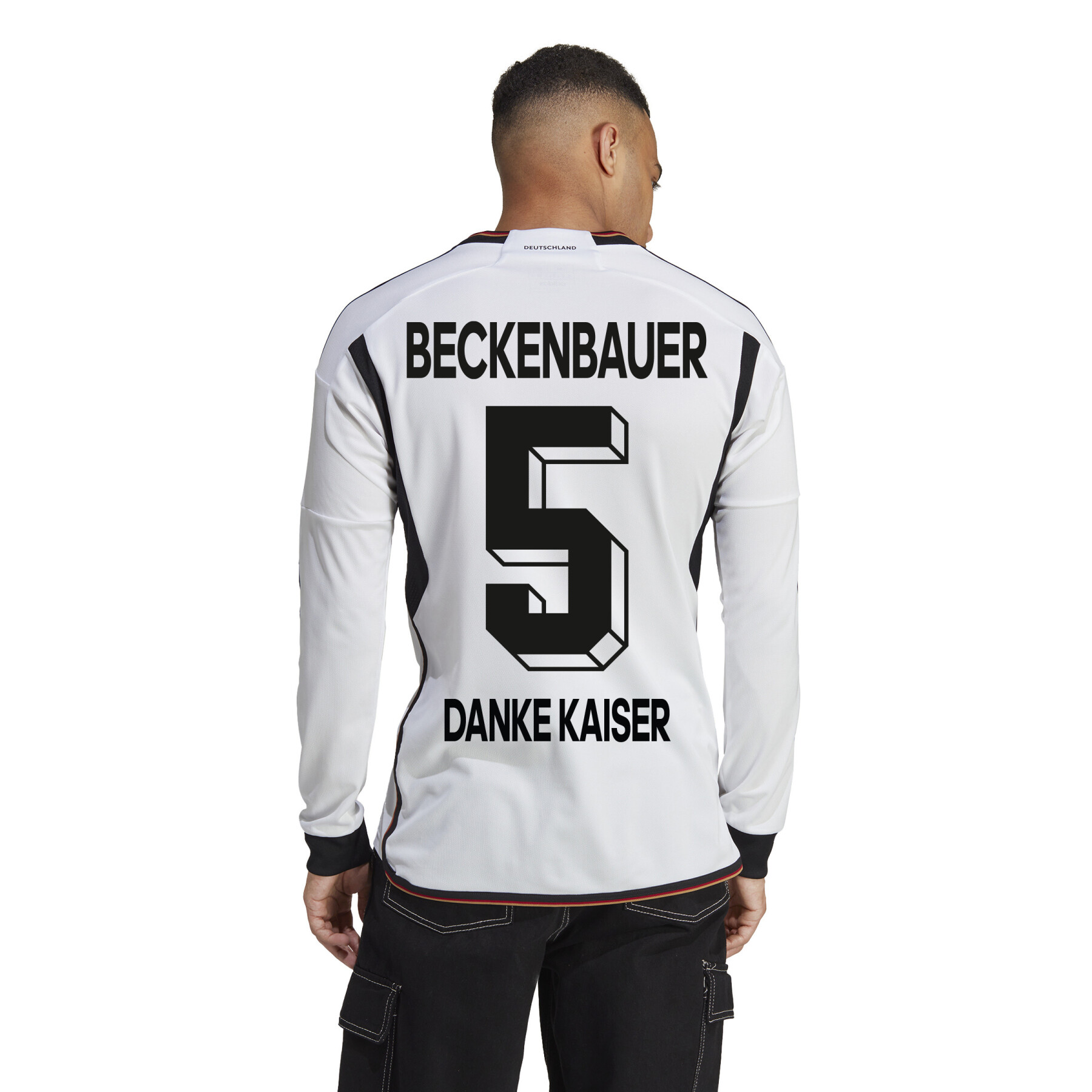 Disponible en seulement quelques exemplaires, le maillot de l’équipe nationale de 2022 est floquée à l’avant de son année de naissance et de son décès (1945-2024). A l’arrière, on retrouve un flocage rétro Beckenbauer et le numéro 5 ainsi que l’inscription en bas du dos « Danke Kaiser »