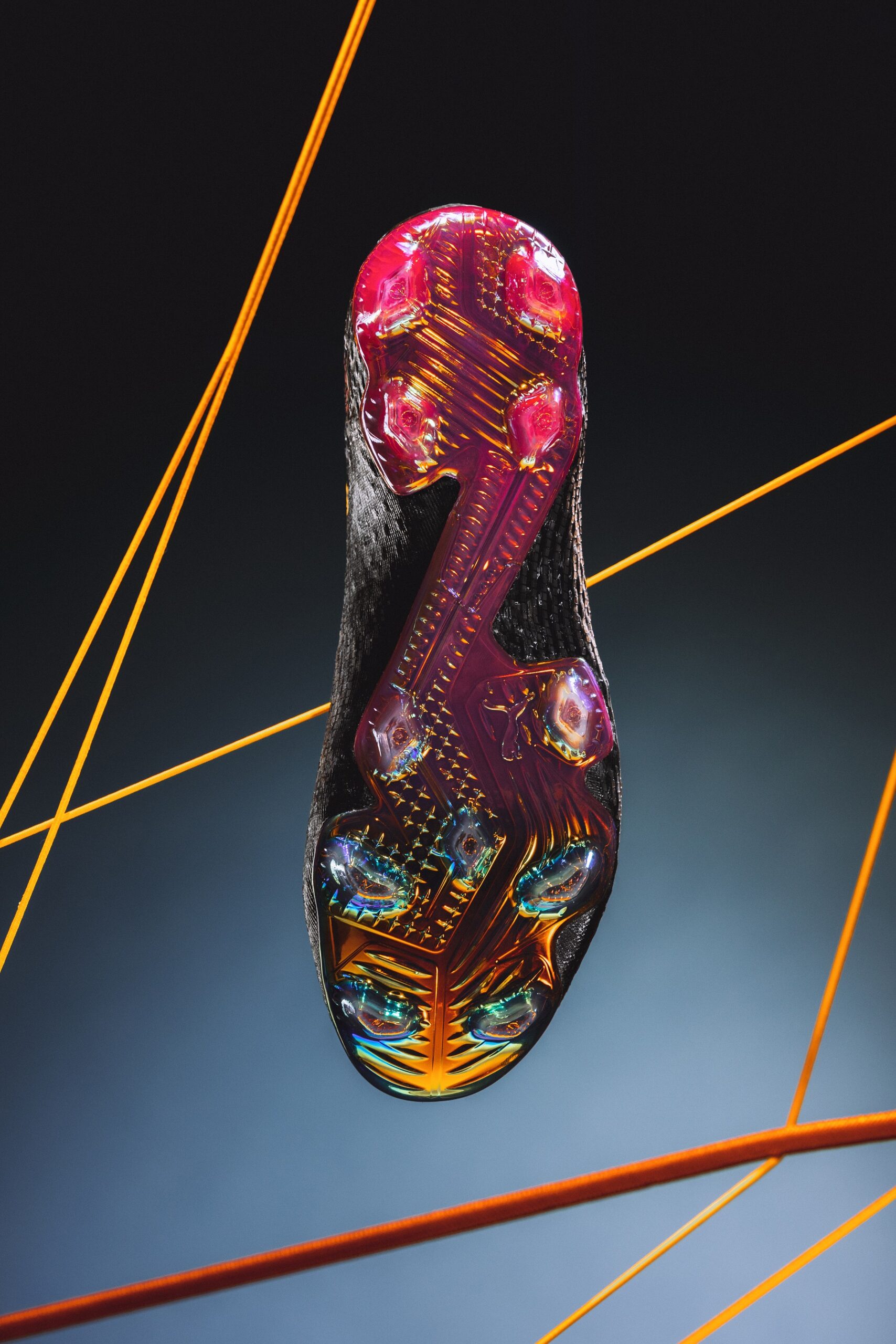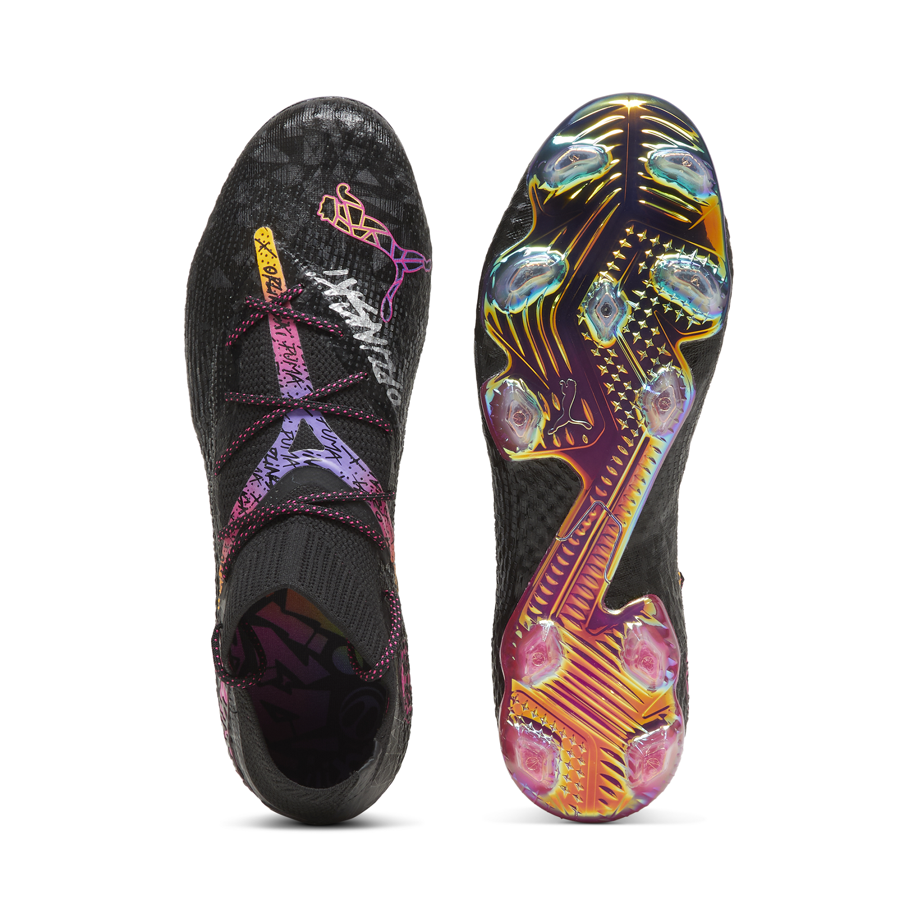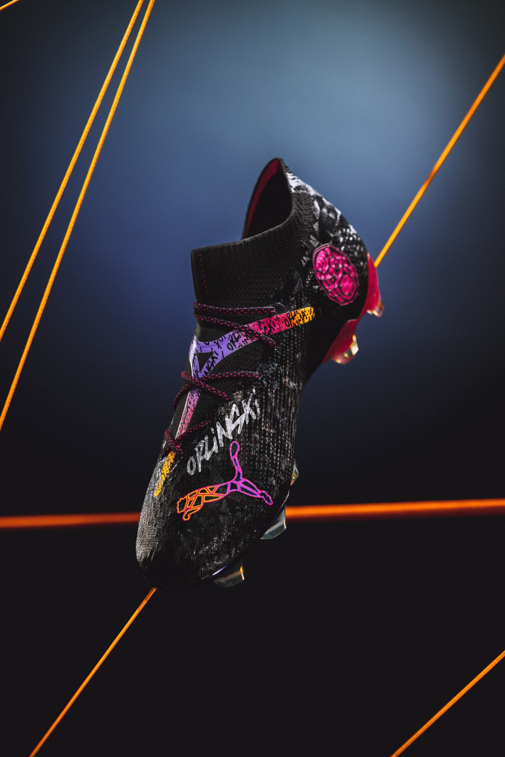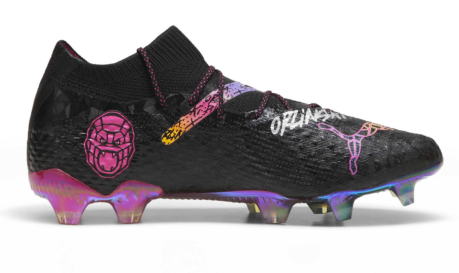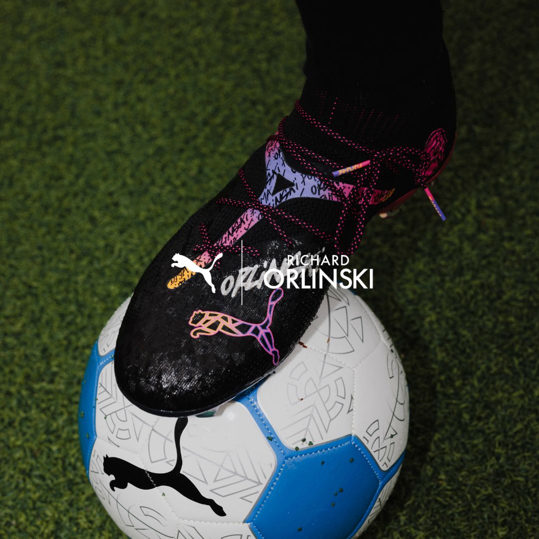 Pour la paire de crampons « Ultimate Orlinski », l’artiste français mise des couleurs vives et des textures 3D. Sur les chaussures, on retrouve évidemment le style Orlinski. Une tête de kong et le félin Puma représenté en lettres ORLINSKI viennent parfaire le look.