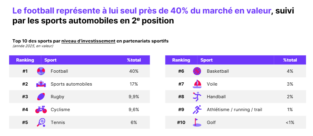 Le football domine largement les investissements avec 40 % du marché, devant les sports automobiles (17 %) et le rugby (9,9 %). Les équipes constituent le principal levier pour les marques, concentrant 65 % des revenus de sponsoring.