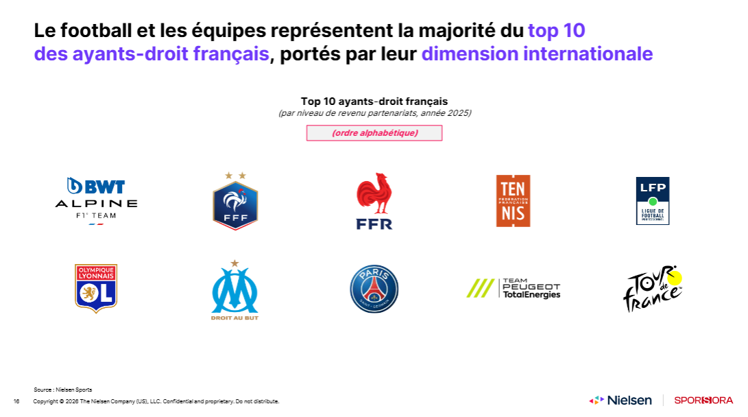 Les ayants droit les plus puissants concentrent une part (très) importante des investissements. Le Paris Saint-Germain domine largement le marché, devant des acteurs comme l’Olympique de Marseille et l’Olympique Lyonnais. Dans les autres disciplines, la Formule 1 et le Tour de France figurent parmi les propriétés les plus valorisées. Cette concentration illustre le poids des grandes marques sportives capables d’offrir une visibilité internationale et des activations à forte audience.