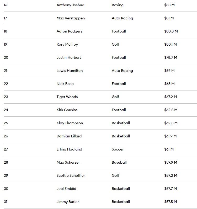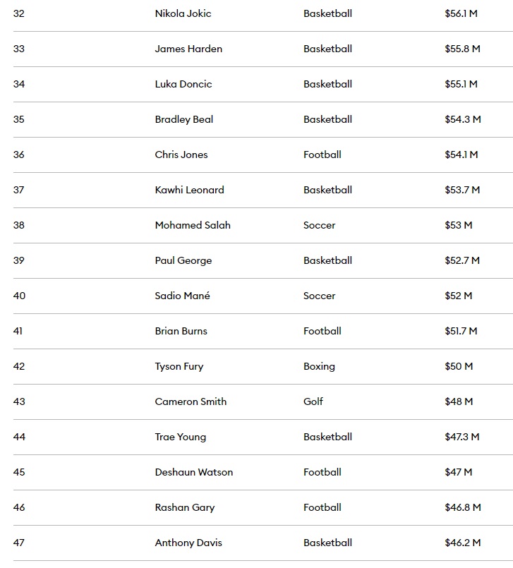 Le TOP 50 des plus gros revenus des sportifs (Forbes 2024)