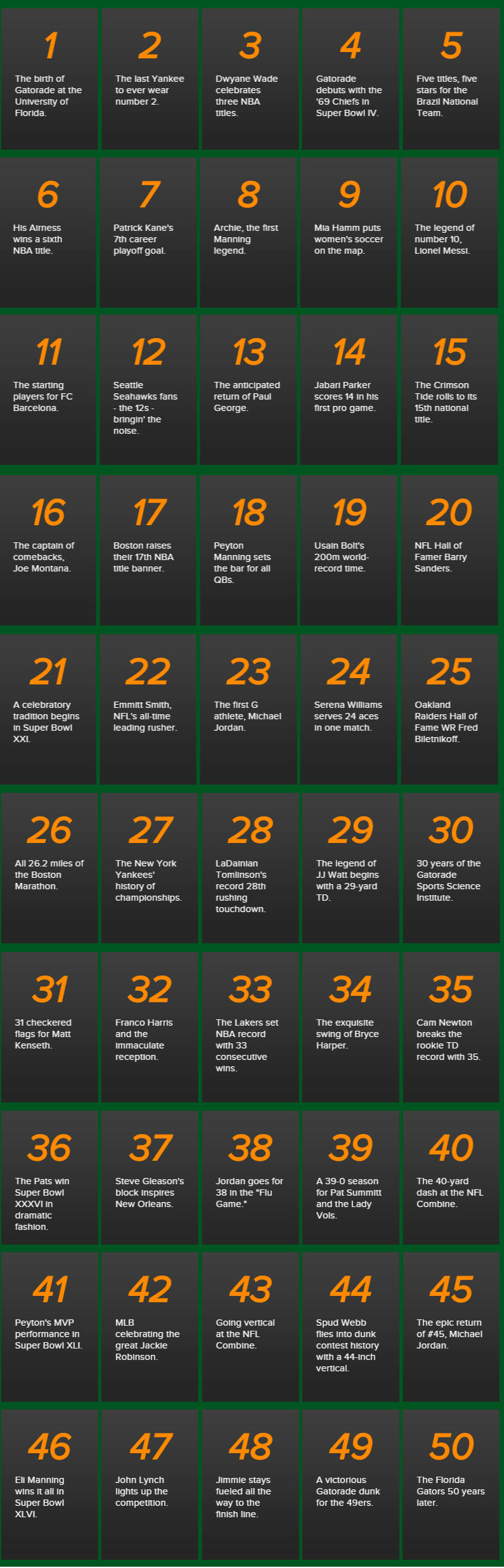 En 2015, la célèbre boisson Gatorade célèbrera ses 50 ans. A quelques jours de cette nouvelle année, le géant américain de la boisson énergétique revient sur 50 années au travers de 50 chiffres qui ont marqué l’histoire du sport associée à la marque; des 5 étoiles de Champion du Monde de Football du Brésil au 19 »19 d’Usain Bolt sur 200m en passant par les 33 victoires de suite des Los Angeles Lakers (1971-1972) ou des 24 aces servis par Serena Williams à Wimbledon lors de son demi finale contre Vika Azarenka en 2012.