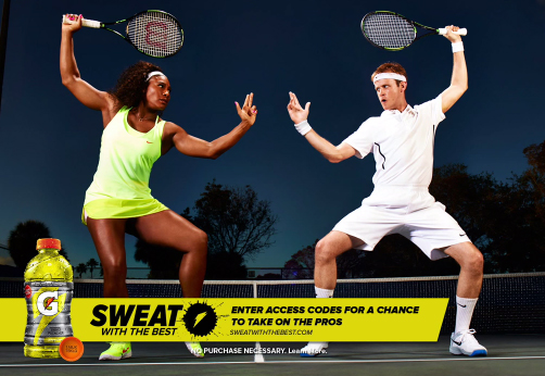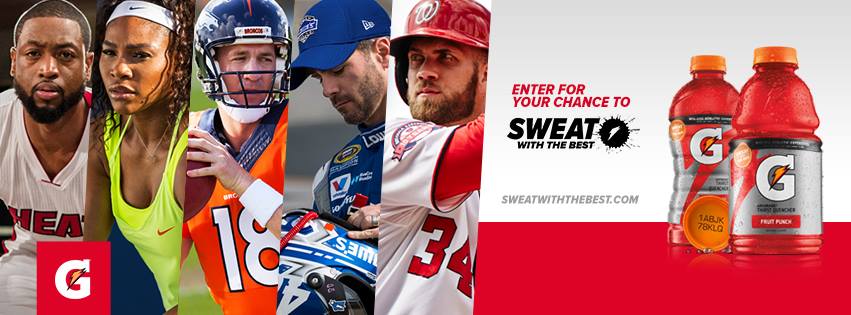 Pour faire le lien entre le business (vente de produits) et la communication, Gatorade lance le dispositif « Sweat With The Best » (Transpire avec les meilleurs). La boisson pour le sport optimise ainsi ses nombreux partenariats sportifs en offrant aux consommateurs différentes expériences « money can’t buy ». L’occasion de rencontrer Serena Williams, Dwayne Wade, Peyton Manning, Patrick Kane… et de venir transpirer avec eux ! Un code promo placé sous le bouchon permet ainsi de remporter de nombreuses dotations sur le site sweatwiththebest.com. De nombreux évènements avec des clubs NFL, NBA, NHL et de football (FC Barcelone, Arsenal…) partenaires sont également proposés !