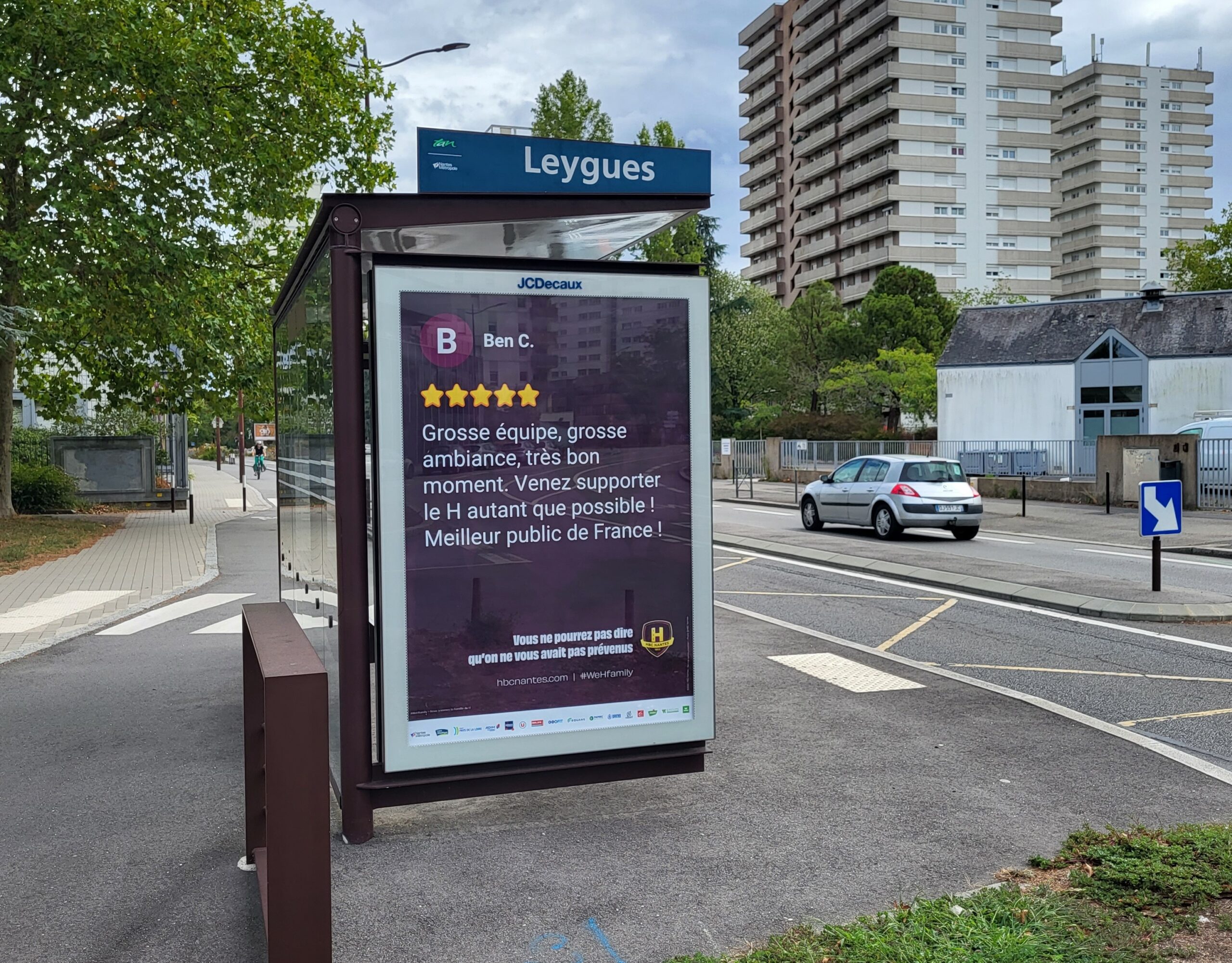 A l’occasion de la reprise du Championnat de France de Handball, le HBC Nantes a lancé une campagne d’affichage extérieur originale en affichant des avis Google de supporters ayant déjà vécus l’expérience de la H Arena.
