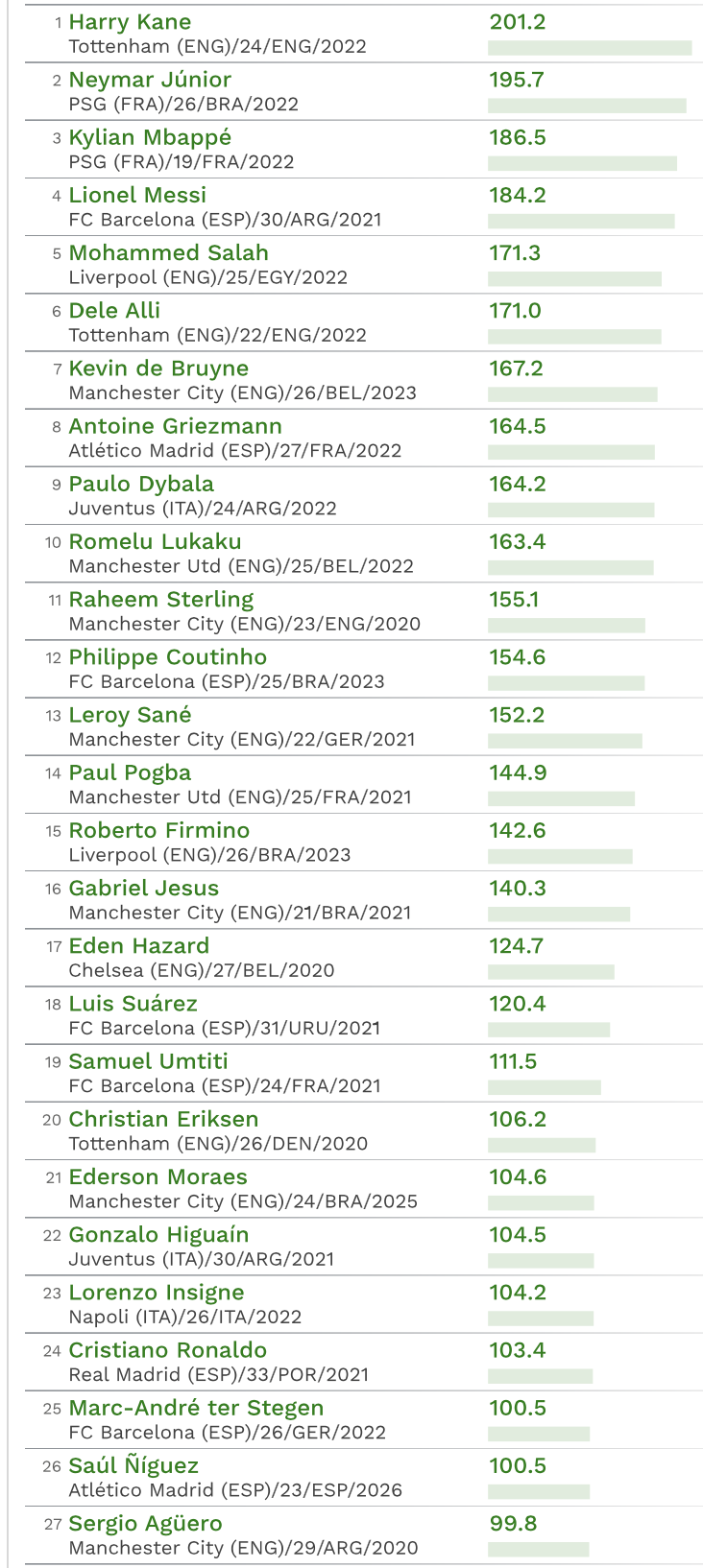 Dans sa dernière Lettre hebdomadaire, l’observatoire du football CIES a dévoilé le Top 100 des joueurs de football les plus chers à la fin de la saison 2017-2018.