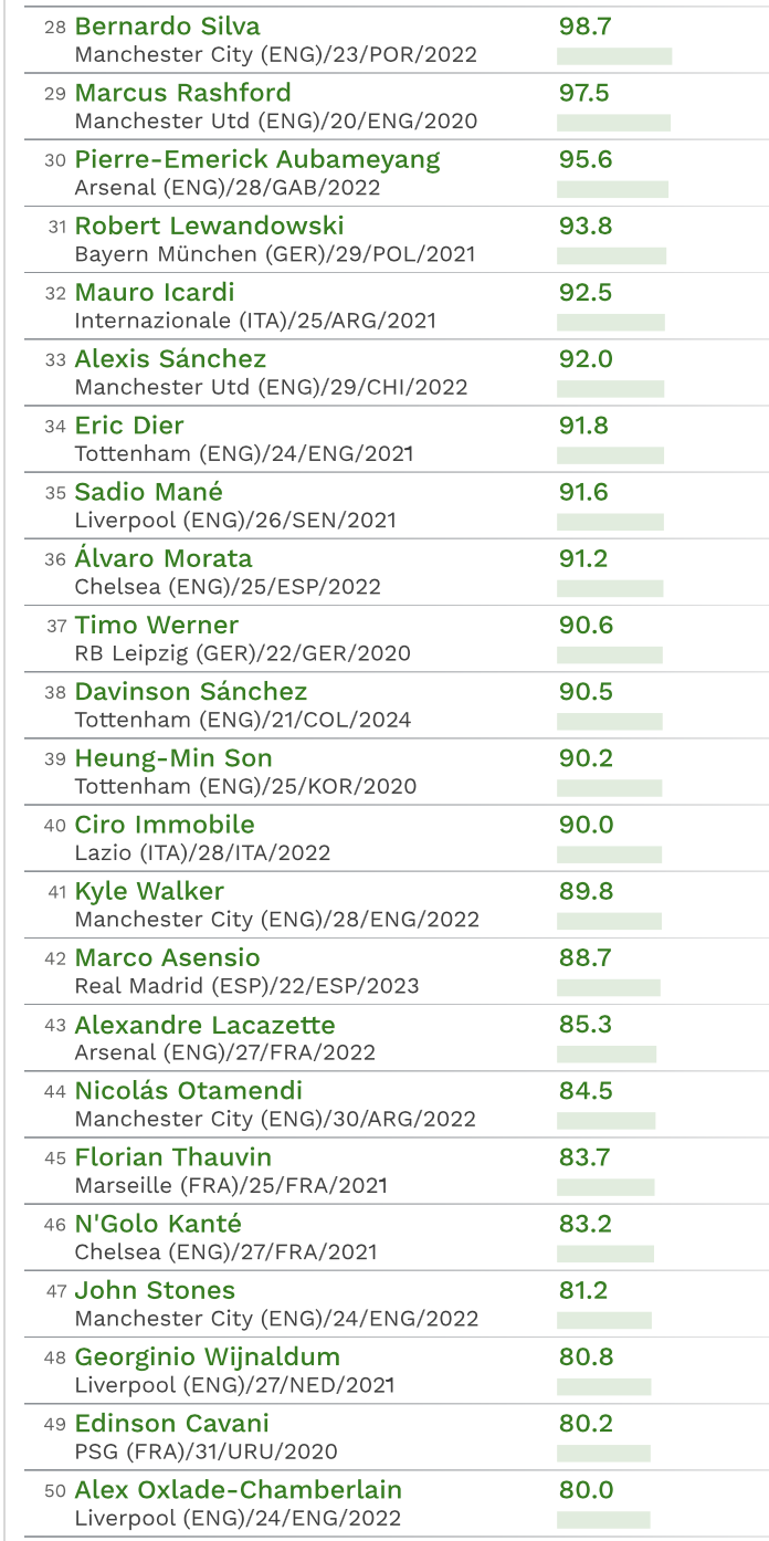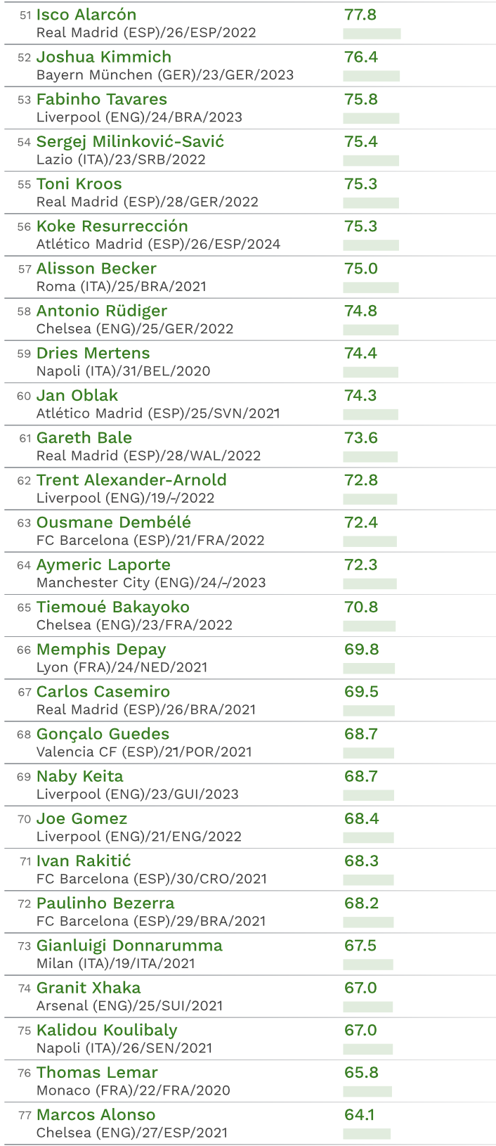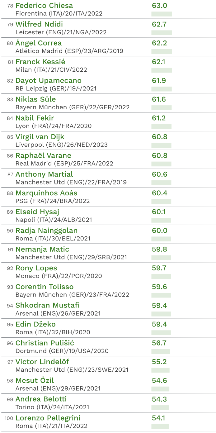 Avec seize joueurs dans le Top 100, la France est le pays le plus représenté. Quatre d’entre eux sont même dans le Top 20 (Kylian Mbappé, Antoine Griezmann, Paul Pogba et Samuel Umtiti). Samuel Umtiti est, selon le CIES, le défenseur central le plus cher de l’Europe, avec une valeur de 111,5 millions d’euros à seulement 24 ans. Ce montant, qui n’est qu’une indication, ne doit pas être pris au pied de la lettre, puisque suite à sa récente prolongation au FC Barcelone, la clause libératoire du défenseur s’élève à 500 millions d’euros.