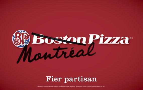 Ce soir c’est le début des playoffs pour Montréal qui affronte Boston. Voici comment une chaine de pizza surfe sur l’actualité sportive: Ne cherchez plus Boston Pizza! Depuis hier, les 26 restaurants de la chaîne situés à Montréal se nomment Montréal Pizza. Pour marquer le coup, à temps pour le début des séries éliminatoires de la NHL entre Boston et Montréal, l’annonceur rature son nom dans les pubs publiées dans les journaux, affichées sur des panneaux géants et même dans ses restaurants.