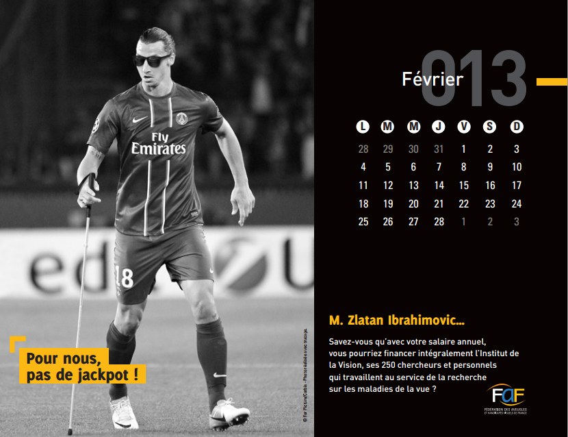 Pour dénoncer la situation, devenue insupportable, des personnes aveugles et déficientes visuelles aujourd’hui en France, la FAF – Fédération des Aveugles et Handicapés Visuels de France – sort pour la troisième année, son calendrier engagé sur le thème de « La bourse ou la vue ? ». Pour cette nouvelle édition, le calendrier met en scène deux sportifs : Zlatan Ibrahimovic et Nikola karabatic. Politiques et acteurs sont également présents.