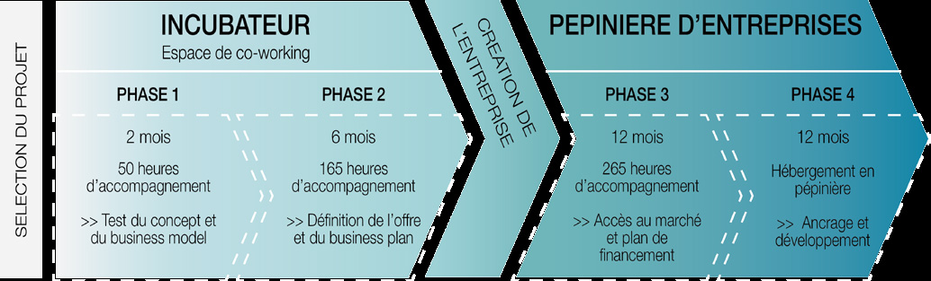 Différentes phases sont définies afin de permettre à l’entrepreneur de dégager sa proposition de valeur, construire le modèle économique, tester le concept sur son marché, définir l’identité de marque, établir son offre et développer son produit/service. Autant d’étapes qui lui permettent de passer de l’idée au lancement sur le marché en moins de 20 mois.