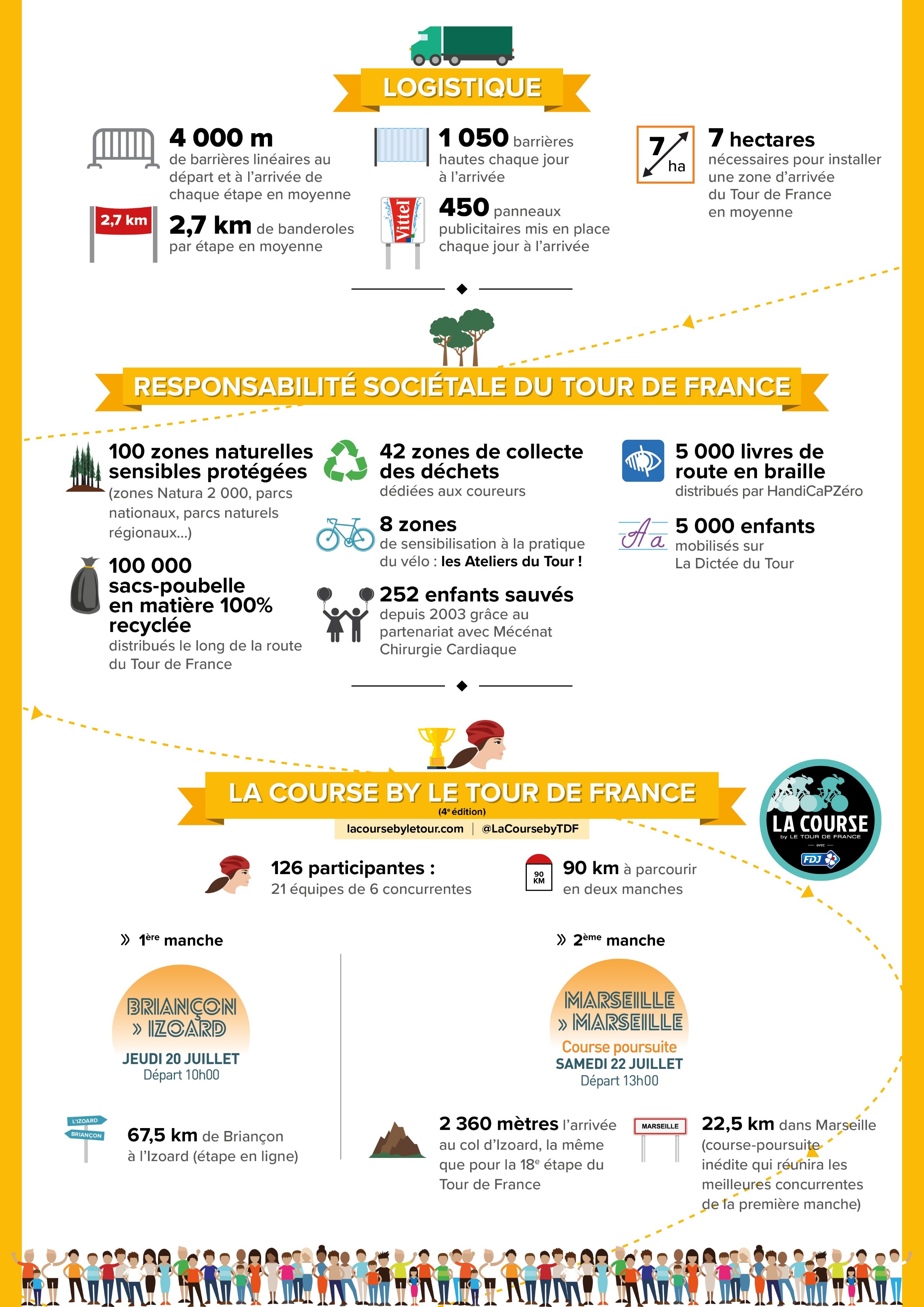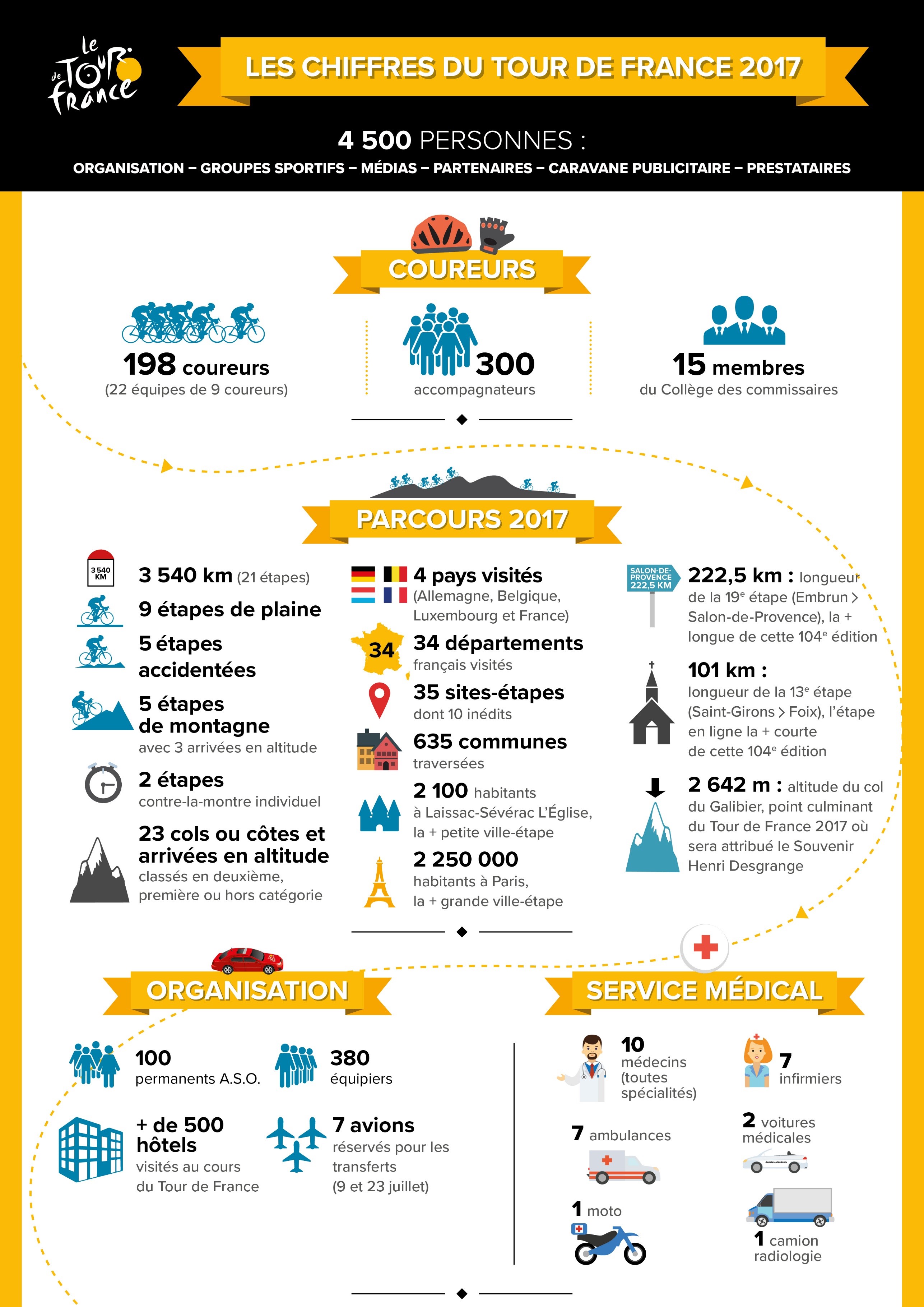 A 10 jours du début du Tour de France 2017, A.S.O. publie une infographie présentant l’organisation du Tour de France.