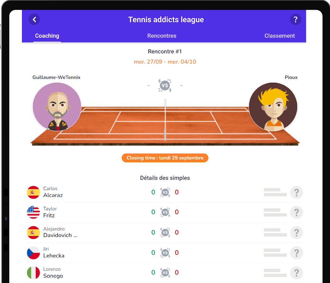 Chaque semaine vous devrez sélectionner 8 titulaires : 6 simples et 1 double. Votre numéro 1 va affronter le numéro 1 adverse, votre double va affronter le double … comme en interclubs.