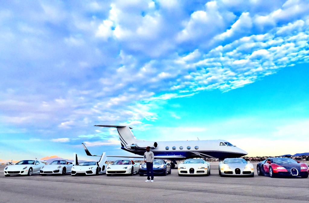 Lundi, le boxeur Floyd Mayweather, sportif le mieux payé entre juin 2013 et juin 2014 avec 105 millions de dollars, a une nouvelle fois été fidèle à sa réputation en exhibant quelques unes de ses grosses voitures sur les réseaux sociaux : 2 Bugatti Veyron, une Bugatti Gran Sport, deux Ferrari 458 Spider, une Lamborghini Aventador, une Porsche 911 Turbo S, une Ferrari 599 GTB Fiorano… ou encore un jet privé figurent sur le tarmac.
